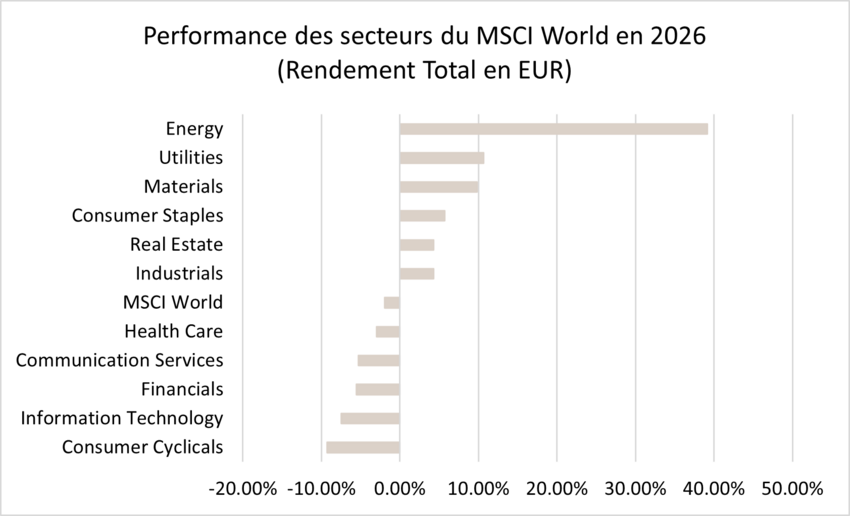 In fact, this strong underperformance reflects concerns about the spread of a growth shock, even though investors are clearly favouring the United States. The outperformance of US markets is notably explained, in theory, by lower exposure to the oil shock, as the country is a net exporter, whereas Europe is typically considered structurally dependent on energy flows from the Strait of Hormuz.