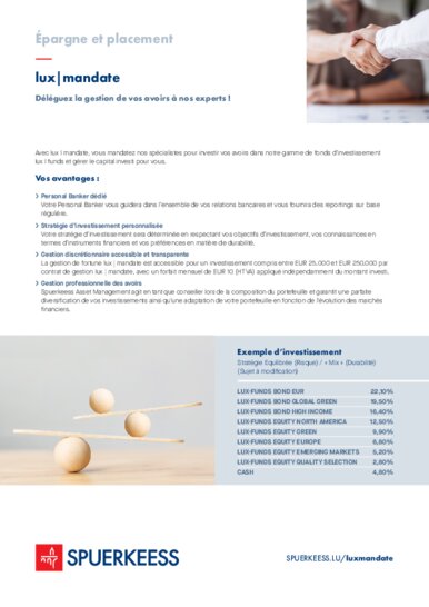 Avec lux|mandate, vous mandatez nos spécialistes pour investir vos avoirs dans notre gamme de fonds d'investissement…